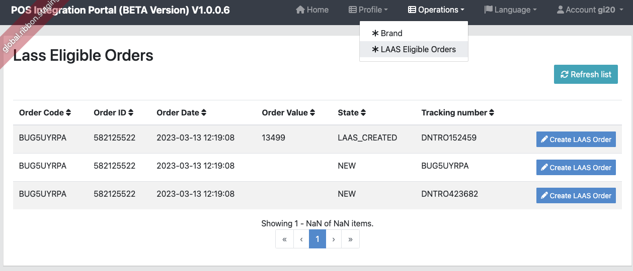 The list will display the latest orders entered into the system that are available to be sent to LAAS Partners. Click the 'Create LAAS Order' option to open the order creation screen.